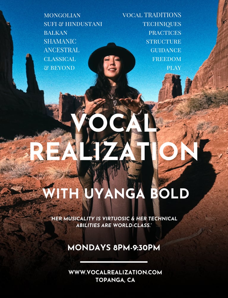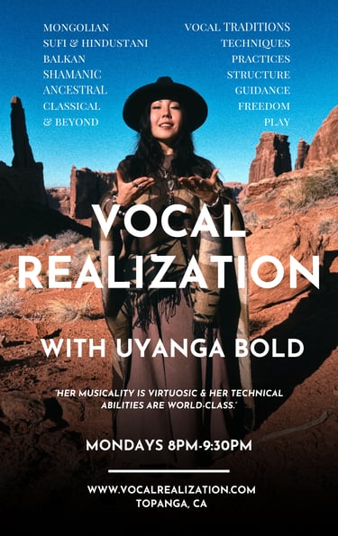Guided by Uyanga Bold, an internationally acclaimed, classically trained Mongolian vocalist with over 25 years of experience performing on world stages and in film and television. The approach integrates Mongolian, Sufi, Hindustani, Balkan, and Shamanic vocal and wisdom lineages with Western classical and contemporary techniques.